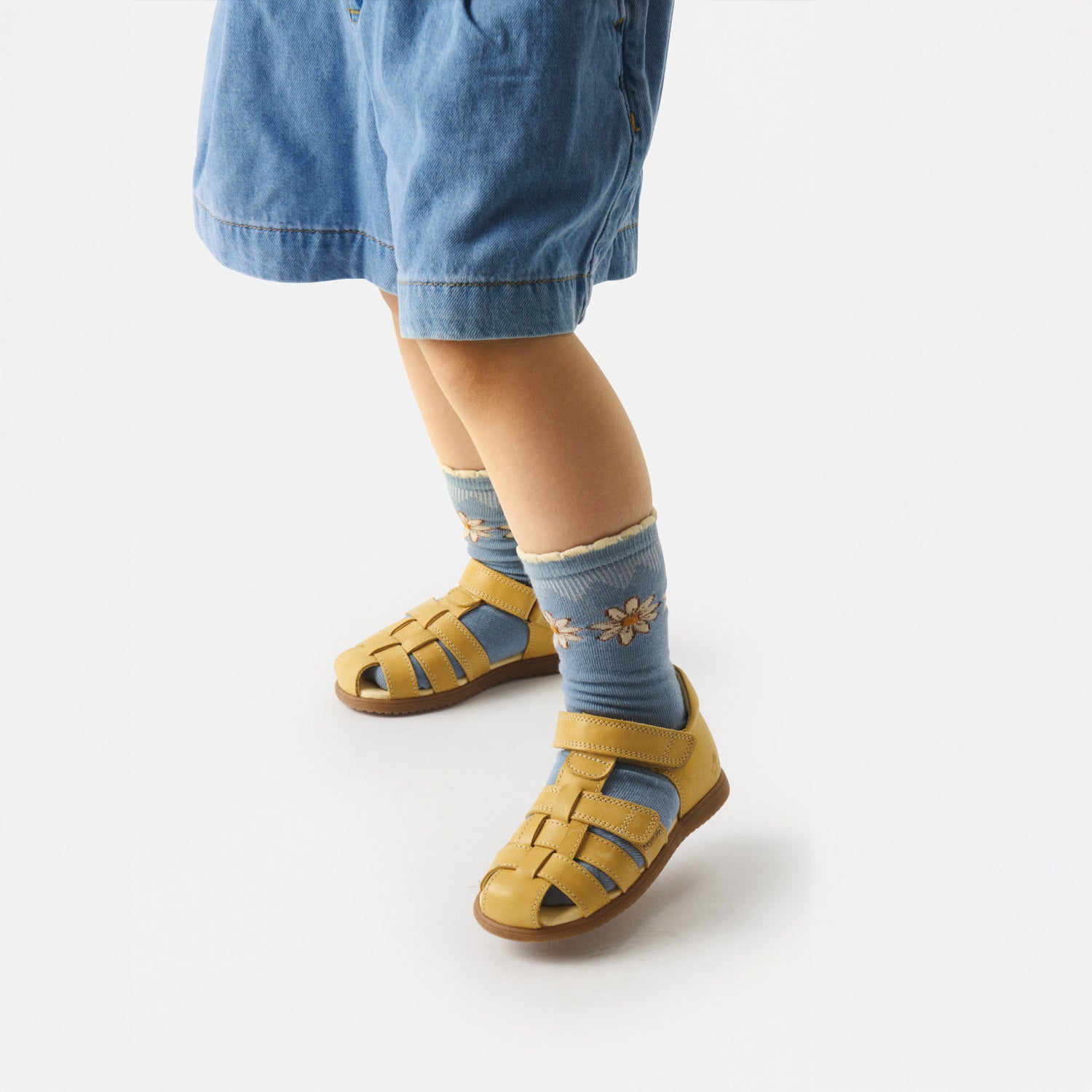 Die Sandale hat einen geschlossenen Zehenbereich, um die kleinen Zehen zu schützen. Gleichzeitig ist die Fersenkappe fest und stabil, gibt dem Fuß den nötigen Halt und trägt zu einem gesunden, stabilen Gang bei.