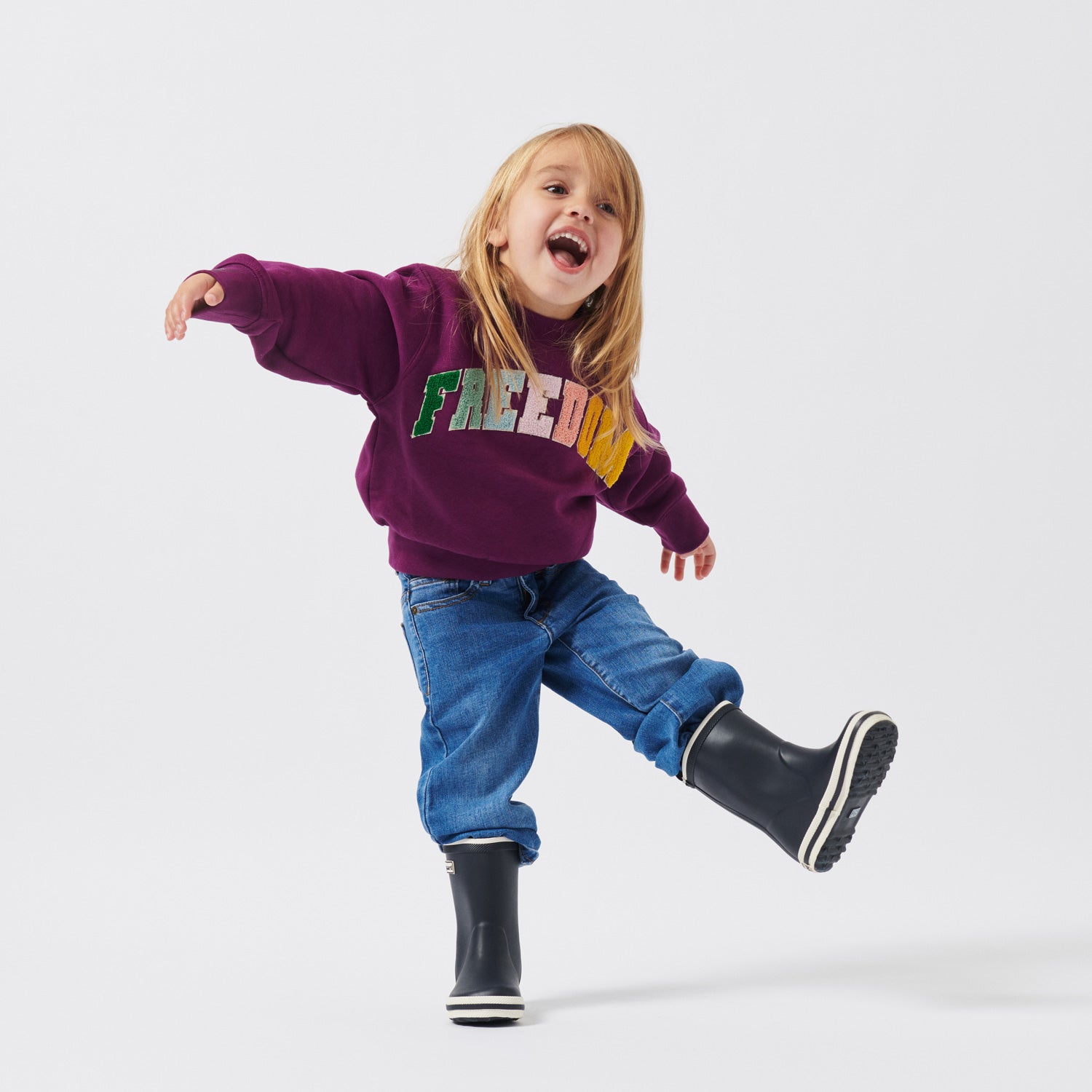 Der Gummistiefel besteht aus Naturkautschuk und ist daher besonders weich und angenehm für das Kind zu tragen. Er hat eine weite und natürliche Passform, die den kleinen Zehen viel Bewegungsfreiheit gibt. Vorne ist er breit und hinten schmal, um optimalen Halt am Fuß zu bieten. Die reflektierenden Details auf der Hinterkappe sorgen dafür, dass die Stiefel bei dunklem Wetter gut sichtbar sind.