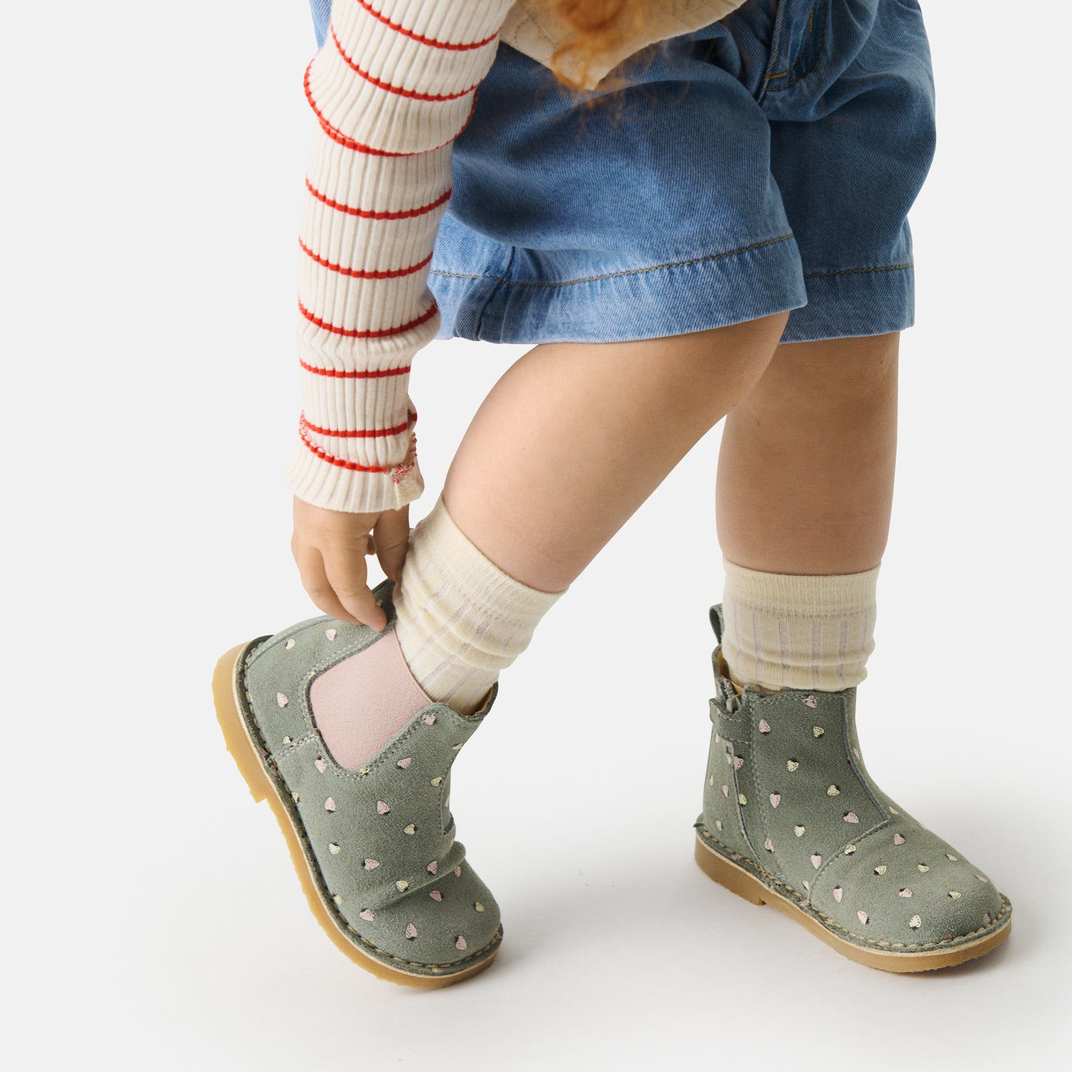 Das Design des Stiefels zeichnet sich durch eine gute, stabile Fersenkappe aus, die dem Kind den richtigen Halt am Knöchel gibt, der wichtig ist, um den ganzen Tag über Komfort und Stabilität zu gewährleisten. Die feste Zehenkappe schützt die kleinen Zehen vor Stößen, so dass sich der Schuh sowohl für das Spielen auf dem Spielplatz als auch für das Gehen auf verschiedenen Untergründen eignet.